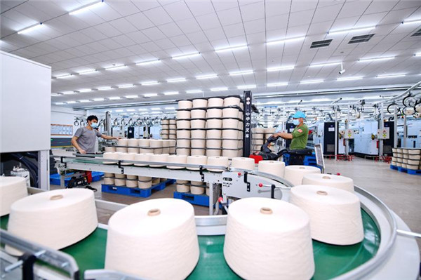 2025年9月17日,位于江西省赣州市于都县的江西卫棉纺织集团有限公司“5G+”智能工厂生产车间里,工人忙着加工棉纺产品。人民网 朱海鹏摄
