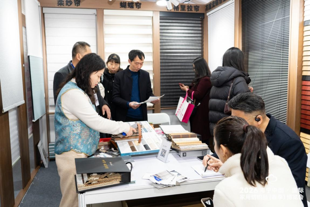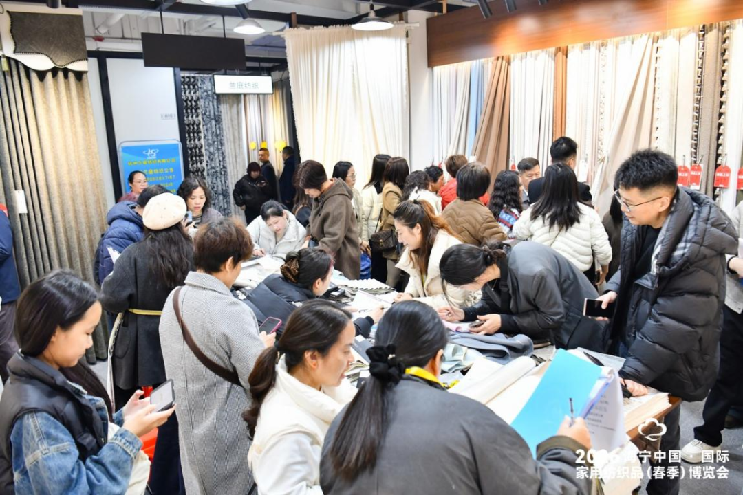 走进海宁阑园纺织品有限公司的门店,仿佛步入一个个精心布置的家居生活场景。各种色彩、风格的成品窗帘整齐悬挂,辅以沙发、抱枕、茶几、鲜花等整体软装搭配,营造出温馨舒适的沉浸式体验空间。来往商客络绎不绝,交流洽谈声此起彼伏,汇成一曲热闹的春日交响。据公司总经理戴庆虎介绍,今年展会他们带来了高精密、雪尼尔、棉麻等14个系列的新产品,以高性价比、过硬品质和独特设计吸引了一大批忠实“铁粉”慕名而来。“很多老客户今天市场刚开门就直奔我们展位,等着看今年的新品。”戴庆虎笑着说道,手中的订单簿已密密麻麻写满意向客户的信息。